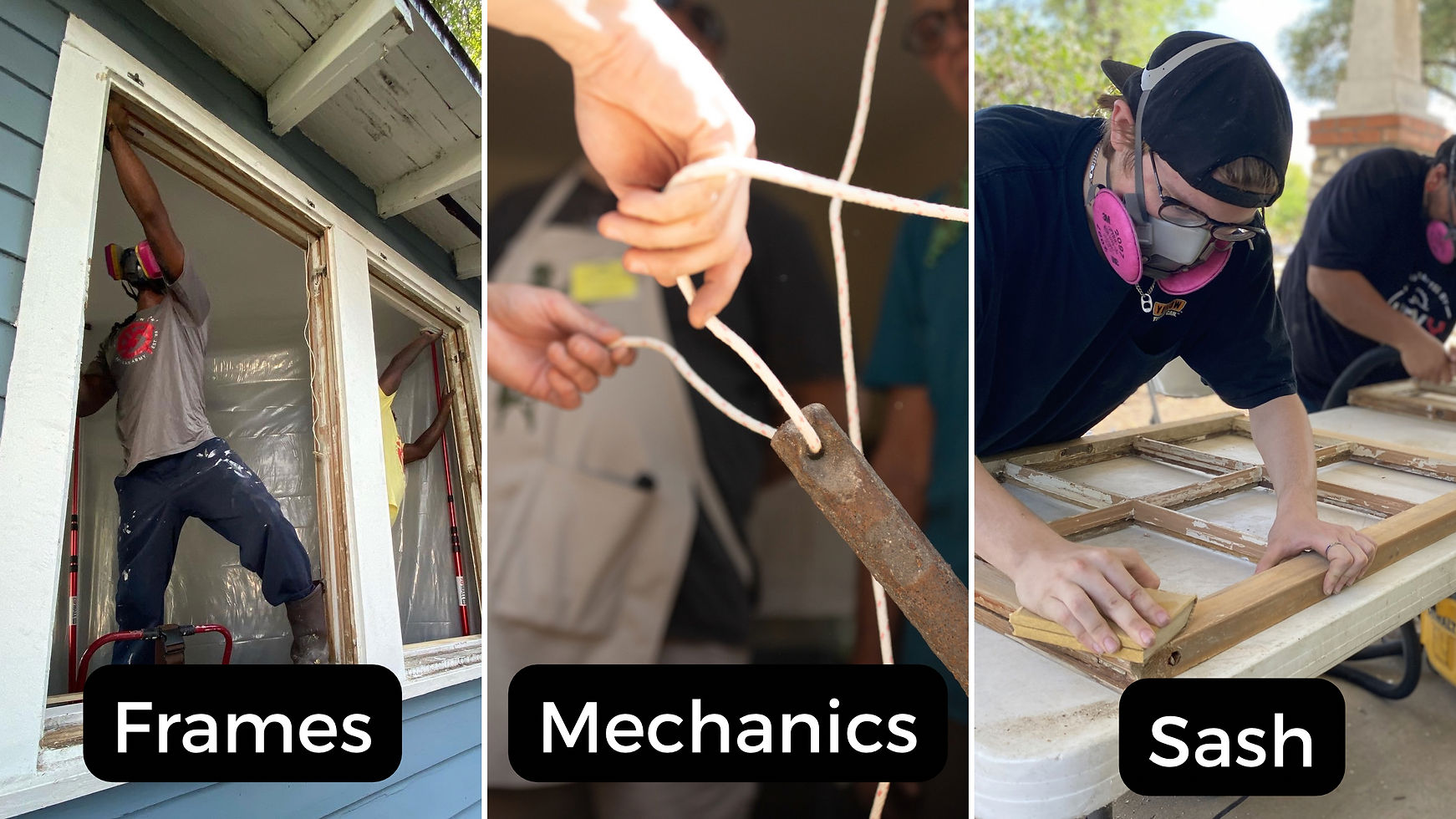 Sash work deals with the movable parts. That includes stripping paint, repairing wood, priming, glazing, and finishing.